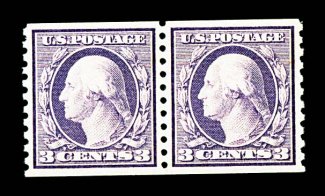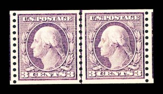 882 og 456 image#456, 3c Violet rotary coil, Ty. I, perf. 10 vert., an exceptionally handsome joint line pair, cut from a strip so that small portions of the adjoining stamps at sides appear, well centered, strong rich color and a crisp detailed impression on bright paper, o.g., faintly hinged, very fine and quite choice; 1988 PF certificate. (Image) $1,250.00
