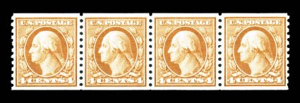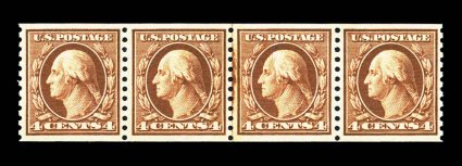 883 nh 457 image#457, 4c Brown rotary coil, perf. 10 vert., mint strip of four, extraordinarily well centered, rich color and impression, o.g., n.h., extremely fine. (Image) $260.00+