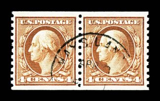 885 O 457 image#457, 4c Brown rotary coil, perf. 10 vert., gem used pair, incredibly well centered, large margins, lovely bright color on fresh paper, especially light and unobtrusive c.d.s. pmk., extremely fine; a highly select and elusive used pair whose modest catalog is quite irrelevant on a pair of this quality; 2000 PF certificate. (Image) $60.00