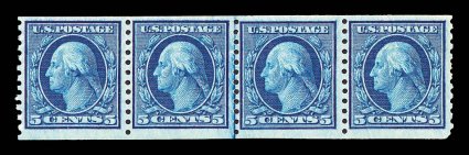 887 og 458 image#458, 5c Blue rotary coil, perf. 10 vert., joint line strip of four, rather well centered, o.g., l.h., very fine; ex-Agris. (Image) $240.00