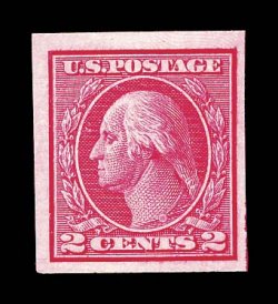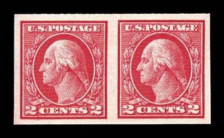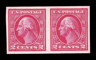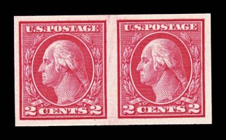 890 nh 459 image#459, 2c Carmine imperforate coil, pristine mint pair, intense color, perfectly centered within large even margins all around, unblemished o.g., n.h., extremely fine; a gem pair; 1997 PF certificate. (Image) $750.00