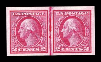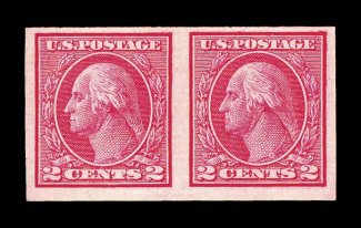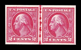 894 nh 459 image#459, 2c Carmine imperforate coil, joint line pair, exceedingly well centered with large balanced margins, brilliantly fresh and crisp, o.g., n.h., light production crease, as usual, affecting the left stamp, still extremely fine and attractive. (Image) $1,600.00