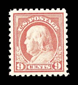 900 nh 471 image#471, 9c Salmon red, premium mint single, flawlessly centered within large margins, bright color, o.g., n.h., extremely fine; surprisingly elusive in this gem condition. (Image) $130.00