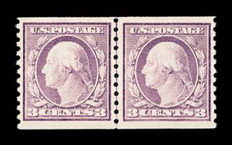 921 nh 493 image#493, 3c Violet coil, Ty. I, perf. 10 vert., joint line pair, extraordinarily bright and fresh, mathematically precise centering amid uncharacteristically large margins, pristine o.g., n.h., extremely fine; an unusually challenging line pair to find in this gem quality; 1988 PF certificate; ex-Lessin. (Image) 230.00