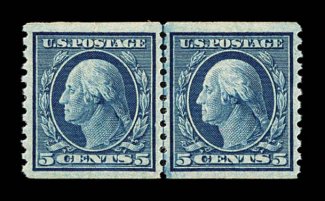 922 nh 496 image#496, 5c Blue coil, perf 10 vert., joint line pair, superbly centered within extra-large margins, deep rich shade and a crisp detailed impression, immaculate o.g., n.h., extremely fine; actually a challenge to find in this gem quality; 2002 PF certificate; ex-McKinney. (Image) 65.00
