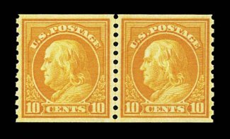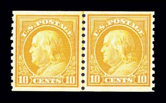 923 nh 497 image#497, 10c Orange yellow coil, perf. 10 vert., joint line pair, incredibly fresh and choice, gorgeous vivid color, outstanding centering, pristine o.g., n.h., extremely fine. (Image) 280.00