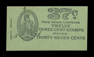 927 BK BK62 image#BK62, 1917 37c Violet on sage complete unexploded booklet of two panes of 3c Violet, Ty.I (#501b), position A, panes with bright color, fine centering, o.g., n.h., covers are fresh and crisp, with only light staple indentations on the reverse from another booklet from post office packaging, very fine and scarce (Furman #BK62 BC6B IIh). (Image) $550.00