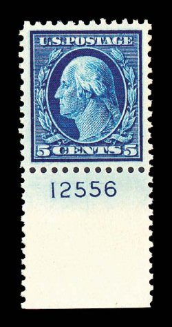 928 nh 504 image#504, 5c Blue, an incredibly select bottom plate no. 12556 mint single, flawlessly centered amid huge jumbo margins, sumptuously rich color and a prooflike impression contribute further to this stamp's remarkable eye appeal, unblemished o.g., n.h., extremely fine gem; 2000 PF certificate. (Image) $19.00