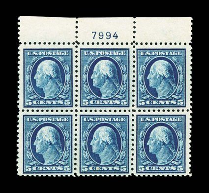 929 nhPB 504 image#504, 5c Blue, top margin plate no. 7994 block of six, rich color, the top middle stamp is especially well centered and margined, o.g., n.h., a few small gum skips, top right stamp with light gum inclusion, very fine overall. (Image) $210.00