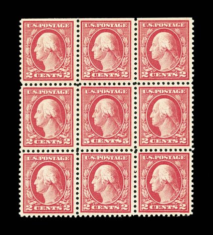 931 nhbl 505 image#505, 5c Rose error, single error in a block of nine, fresh color, o.g., n.h., trivial inclusion in the top middle (2c) stamp, fine-very fine. (Image) $1,150.00
