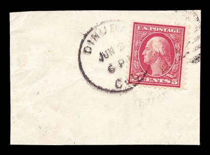 932 O 505 image#505, 5c Rose error, tied to piece by June 2, 1917 duplex, being a nice contemporaneous usage only a few months after issuance, quite well centered, bright color, very fine; a very scarce certified example being far more difficult to find used than mint; 2002 PF certificate. (Image) $550.00