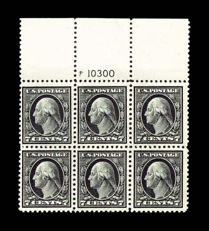 935 nhPB 507 image#507, 7c Black, full top margin plate no. F 10300 block of six, well centered, strong fresh color, o.g., n.h., faint crease in the selvage only, otherwise very fine. (Image) $430.00