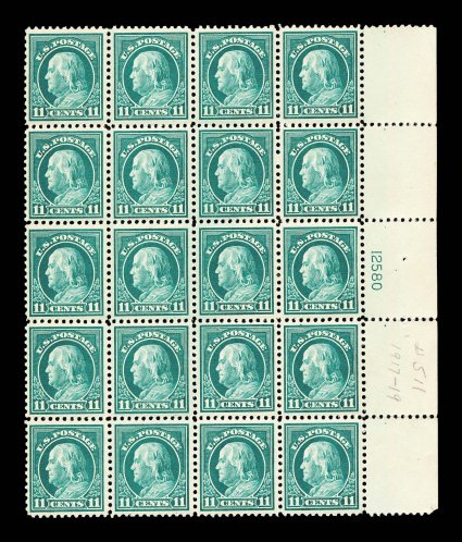 936 nhPB 511 image#511, 11c Light green, right margin plate no. 12580 block of twenty (4x5), many well centered stamps including some choice gems, o.g., n.h. (one stamp with trivial gum wrinkle), some perf. separation in the selvage and selvage corner crease at top right, very fine-extremely fine. (Image) $476.00+