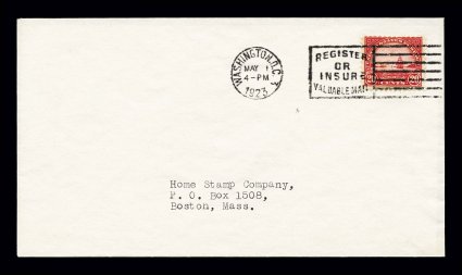 970 F 567 image#567, 20c Carmine rose, fresh single centered a bit to top, tied to first day cover with neatly typed address by "Washington, D.C./May 1/1923" slogan machine cancel, very clean, an extremely fine cover. (Image) $500.00