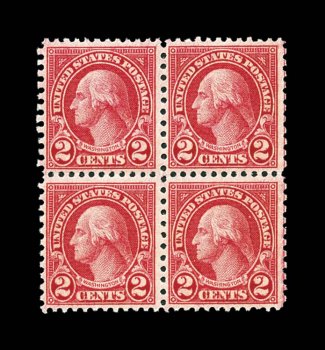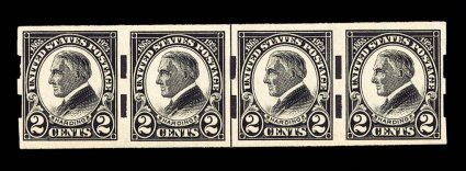 979 og 611 var. image#611 var., 2c Harding imperforate, Schermack Ty. III perforations, guide line strip of four, exceptionally well centered, o.g., l.h., small thin in right stamp, remainder of the strip extremely fine; 1989 APS certificate; ex-Cohen, Agris; cataloged as a guide line pair plus a normal pair. (Image) $255.00