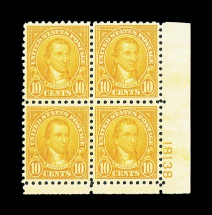 973 ogPB 591 image#591, 10c Orange, bottom right margin plate no. 18138 block of four, intensely rich color, particularly well centered, o.g., faintest possible trace of hinging, choice very fine; 2004 PF certificate. (Image) $500.00