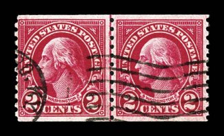 977 O 599, 599A image#599, 599A, 2c Carmine coil, Ty. I and Ty. II combination joint line pair, a seldom seen used example of this scarce line pair, left stamp being Ty. II, while the right stamp is Ty. I, particularly well centered, gorgeous color in an intense shade, neat strikes of double oval postmarks, very fine and quite choice; 1988 PF certificate. (Image) $1,000.00