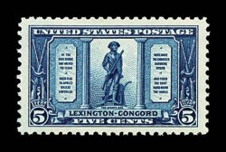 980 nh 617-19 image#617-19, 1c-5c Lexington-Concord cplt., each a remarkable jumbo-margined mint single, marvelously well centered within these impressive margins, bright fresh colors, o.g., n.h., extremely fine; a particularly select set; ex-Floyd. (Image) $44.50