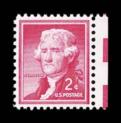 1000 nh 1033a image#1033a, 2c Carmine rose on silkote paper, right sheet-margin single, exceedingly well centered, bright and fresh, o.g., n.h., extremely fine; 1999 PF certificate for a block of four, this being the bottom right stamp. (Image) $600.00