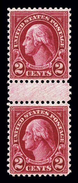 986 nh 634A image#634A, 2c Carmine, Ty. II, vertical pair with horizontal gutter between, a fabulously fresh and choice example of this inter-pane pair from the original sheet of 400 subjects, incredibly intense "fiery" color, outstanding centering for this scarce type, o.g., n.h., certainly extremely fine for this; this rare and seldom offered position piece appears to have been more readily available than many other gutter pairs which were issued only in error, yet Scott's value seems not to have stayed current when the sum of two n.h. singles (the price quoted here) is greater than the listing for the gutter pairs; photocopy of a 1995 PF certificate for a block of four, this being the right pair. (Image) $1,200.00+