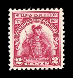 987 nh 657a image#657a, 2c Sullivan, lake shade, very well centered within especially wide margins, strong true lake color, o.g., n.h., choice very fine; a very elusive shade, particularly in this premium quality; 2004 PSE certificate for a block of four, this being the bottom left stamp. (Image) $550.00