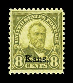 988 nh 658-68 image#658-68, 1c-10c "Kans." ovpts. cplt., an unusually choice mint set where each stamp was selected for its exceptional freshness and centering, several of which have much larger margins than usual, all with pristine o.g., n.h., very fine-extremely fine or better; 1996 PF certificate for the 8c value. (Image) $467.25