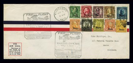 990 F 658-68 image#658-68, 1c-10c "Kans." ovpts. cplt., tied to large FDC, which is also a FFC from Kansas City, Mo. to St. Louis, Mo., posted in Kansas City, Kans. making it a first day used in Kansas, as opposed to most full set FDC's that were posted in Washington, D.C., stamps are tied by "Kansas City/Kans./May 1/1929" duplex pmks., black flight cachets, small edge faults to the 3c and 4c values, otherwise fine and a scarce first day cover. (Image) $1,300.00
