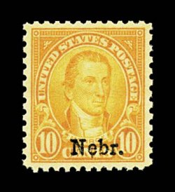 991 nh 669-79 image#669-79, 1c-10c "Nebr." ovpts. wonderfully select and choice set, each brilliantly fresh and unusually well centered, pristine o.g., n.h., very fine-extremely fine; the perfect companion set to the "Kans." overprints offered in a previous lot; 1996 PF certificate for the 10c value. (Image) $579.25
