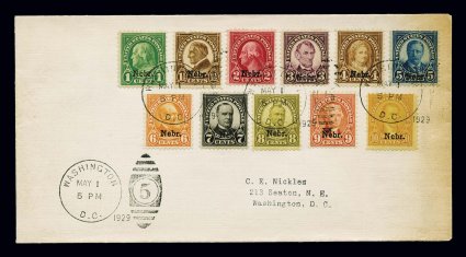 992 F 669-79 image#669-79, 1c-10c "Nebr." ovpts. cplt., on single neat FDC by C.E. Nickles, tied by "Washington, D.C./May 1/1929" duplex cancels, with an additional strike at the bottom left, stamps are fresh with bright color, with fine-very fine centering, light edge age toning at right of cover barely affecting a single stamp, otherwise very fine and scarce cover. (Image) $1,300.00