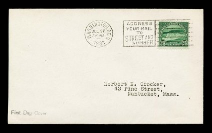 993 F 699 image#699, 25c Blue green, attractive single with rich color, very neatly tied to first day cover by "Washington, D.C./Jul 27/1931" slogan machine cancel, neatly typed address and small "First Day Cover" handstamp at bottom left, extremely fine. (Image) $350.00