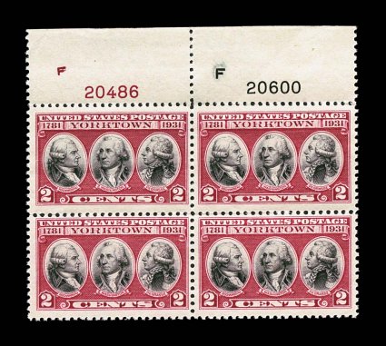 994 ogPB 703b image#703b, 2c Yorktown, dark lake and black error of color, full top margin arrow and plate nos. 20657, 20649 block of four of this rare color error, strong rich colors, attractively centered for this, o.g., n.h. except faintly hinged in the ungummed selvage where some perfs. were reinforced, very fine; one of just a few plate blocks of this color error known. (Image) $2,250.00