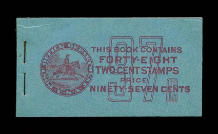 995 BK BK94 image#BK94, 1939 97c Red on blue complete unexploded booklet of eight panes of 2c Rose carmine with 3mm spacing (#806b), well centered panes, o.g., n.h., especially crisp covers with bright colors, extremely fine (Furman #BK94 BC5A IVd). (Image) $400.00