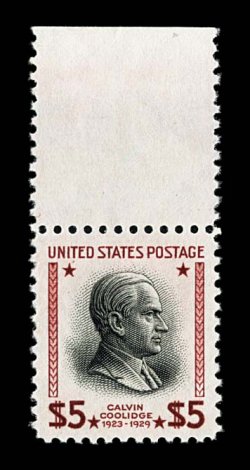 999 nh 834a image#834a, $5.00 Red brown and black error of color, an outstanding top sheet-margin single of this error rarity, extraordinarily well centered within very large margins, strong rich colors, pristine o.g., n.h., extremely fine and uncommonly choice; signed Costales in the top sheet margin, and accompanied by a 1999 PF certificate. (Image) $3,000.00