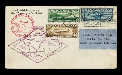 1030 c C13-15 image#C13-15, 65c-$2.60 Graf Zeppelins cplt., all tied to single small size cover by "Varick St. Sta., N.Y./Apr.26/1930" machine cancel, interestingly this cover was flown on the leg from Friederichshaven to Lakehurst even though the postage was sufficient to fly the round trip from Friederichshaven to Friederichshaven, both flight cachets and backstamped Lackehurst, slight edge soiling, otherwise very fine and quite scarce with the full set on one cover. (Image) $1,135.00+