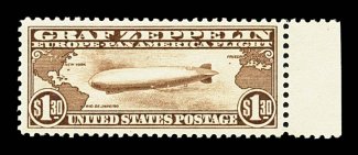1033 nh C14 image#C14, $1.30 Graf Zeppelin, right sheet-margin single, wonderfully well centered within large even margins, fresh bright color, o.g. n.h., extremely fine; 1980 PF certificate. (Image) $700.00