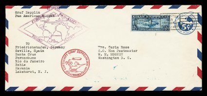 1037 c C15 image#C15, $2.60 Graf Zeppelin, exceptionally attractive and precisely centered single with large margins, tied to large 5c Blue air post postal envelope (#UC1) by "Varick St. Sta., N.Y./Apr. 25/1930" machine cancel, with c.d.s. portion of the postmark nearly completely on the stamp, violet U.S. and red German flight cachets, backstamped Lakehurst, fresh and crisp cover, without the edgewear associated with these large envelopes, both the cover and stamp being extremely fine. (Image) $600.00