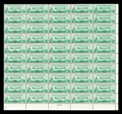 1038 nhbl C18 image#C18, 50c Graf Zeppelin, full bottom plate no. 21171 pane of 50, very fresh, several well centered stamps, o.g., n.h., a few minor perf. separations as expected (not affecting the plate block), fine-very fine. (Image) $4,880.00+
