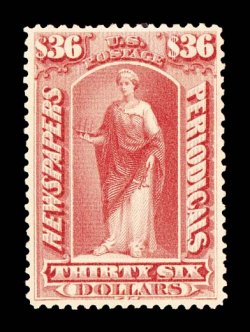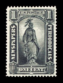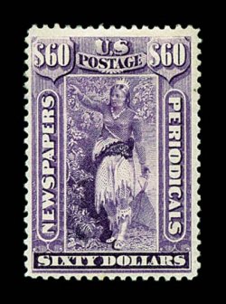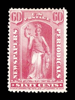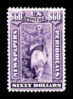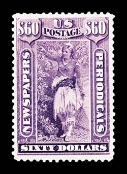 1107 og PR79 image#PR79, $60.00 Purple, attractive mint example of this scarce newspaper stamp, gorgeous rich color and a clean impression, uncharacteristically well centered within large margins, o.g., lightly hinged, choice very fine; 2002 PF certificate. (Image) $825.00
