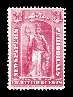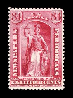 1112 nh PR88 image#PR88, 84c Carmine, pristine mint single, with especially deep intense color and impression, quite well centered, fresh o.g., n.h., very fine; particularly difficult to find never hinged; 2002 PSE certificate for a block of four, this being the top left stamp. (Image) $725.00