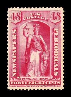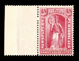 1109 nh PR85 image#PR85, 48c Carmine, handsome mint left sheet-margin single, incredibly fresh with luxuriant deep color, attractive centering, crisp even perforations all around, full o.g., never hinged, very fine and seldom available in never hinged condition; 2004 PSE certificate for a block of four, this being the top left stamp. (Image) for hinged $300.00
