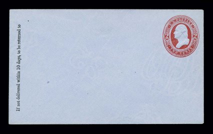 1157 ogc U245 image#U245, 2c Red on blue, 2 links, die 77, size 7, knife 31, wmk. 6, attractive mint entire with the scarce die showing 2 links below the right "2", the only envelope that comes in this die on blue paper, printed return message at left very fine and choice (UPSS #747). (Image) $625.00