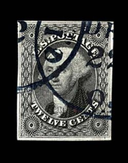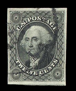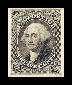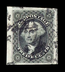 105 O 17 image#17, 12c Black, an incredible quality used single of this difficult imperforate classic, featuring large to huge margins all around which are most uncharacteristic of this, but just as impressive is the stamp's spectacularly intense "jet" black color and prooflike impression, light black c.d.s. town cancel, extremely fine; an unusually fresh and attractive gem example; 1992 PF certificate. (Image) $325.00