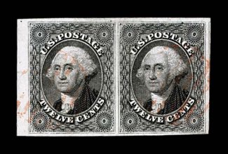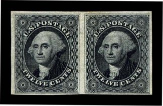 102 og 17 image#17, 12c Black, a very rare mint horizontal pair, ample to mostly large margins all around, strong color and impression, o.g., light horizontal crease that ends in a small margin tear at right and a tiny thin speck in the margin between the stamps, very fine appearance; mint multiples of this stamp are very seldom offered in any condition. (Image) $12,500.00