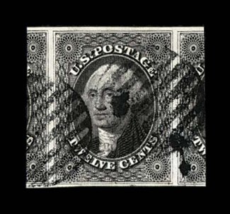103 O 17 image#17, 12c Black, position 78L, an incredible quality used example of this difficult imperforate classic, featuring huge margins all around that are perfectly balanced, showing substantial portions of the adjacent stamps at sides, features that are most uncharacteristic of this issue, but just as impressive is the stamp's spectacularly intense "jet" black color and prooflike impression, plus black seven bar circular grid cancels, extremely fine; an impressive gem; 1988 PF certificate. (Image) $325.00