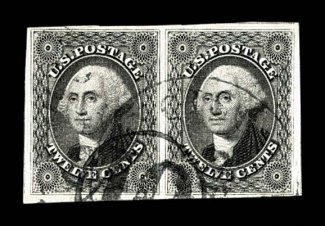 108 O 17 image#17, 12c Black, a fabulous quality used horizontal pair of this always difficult classic, being in a condition which places it among the finest quality used pairs of the 1851 Twelve Cent Imperforate in existence, possessing large to huge margins all around, including a 2 1/2mm sheet margin at left, strong rich color and an extraordinarily detailed impression on bright fresh paper, all marvelously complemented by very light and unobtrusive strikes of red grid cancels, extremely fine in every regard; a gem pair with incredible eye-appeal; 1993 and 2002 PF certificates. (Image) $720.00