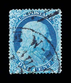 110 O 18 image#18, 1c Blue, Ty. I, perfectly centered within uncharacteristically large margins, bright rich color distinctive to stamps from Plate 12, neat "New-York" c.d.s. cancel, extremely fine; seldom encountered so well centered and margined; 1998 PSE cerificate. (Image) $650.00