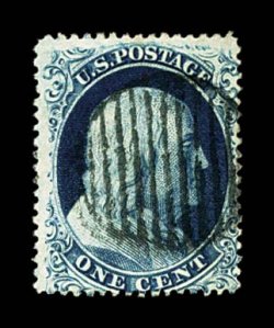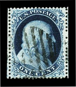 119 O 22 image#22, 1c Blue, Ty. IIIa, position 72L4, an extraordinary quality used example, fabulously well centered within large margins, in fact the design is essentially clear of the perforations all around (a very rare occurrence), scissors separated at sides leaving small tabs of the next stamps, however most spectacular is the incredibly deep and absolutely vivid color that this stamp possesses, with a highly detailed impression on bright paper that makes plating a snap, neat central black grid cancel, an extremely fine used gem; a true condition rarity whose equal would be a challenge to locate; 1996 PF certificate. (Image) $550.00
