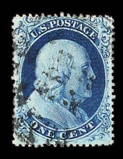 111 O 18 image#18, 1c Blue, Ty. I, an impressively large-margined used example, with uncharacteristically wide margins all around and being perfectly centered within them, rich luxuriant color, black town postmarks, extremely fine; rarely seen this well centered and margined; 1984 PF certificate. (Image) $650.00