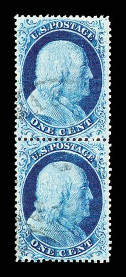 116 O 20 image#20, 1c Blue, Ty. II, extraordinarily handsome vertical pair, positions 4L2/14L2, unusually well centered and margined for this with the horizontal perfs. between the stamps precisely placed between the designs though the holes are larger than the space available, illustrating how tightly these stamps were set on the plate, deep luxuriant color and an excellent clarity of impression on especially bright paper, very light town c.d.s. cancel, extremely fine; 1987 PF certificate. (Image) $625.00