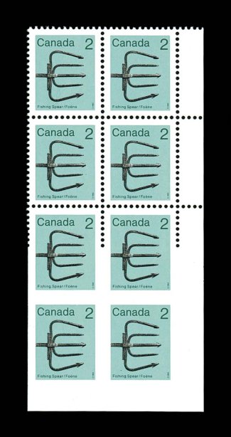 1323 nhPB 918b image#918b, 1984 2c Fishing spear, imperforate at bottom, bottom right corner margin block of eight, bottom pair imperforate and pair above partially perforated, this position is considered a non-inscription plate block, the error is caused by a shift in the perforation leaving only the bottom row completely imperforate, o.g., n.h., extremely fine and rare (Unitrade C$3,000.00). (Image) $1,500.00